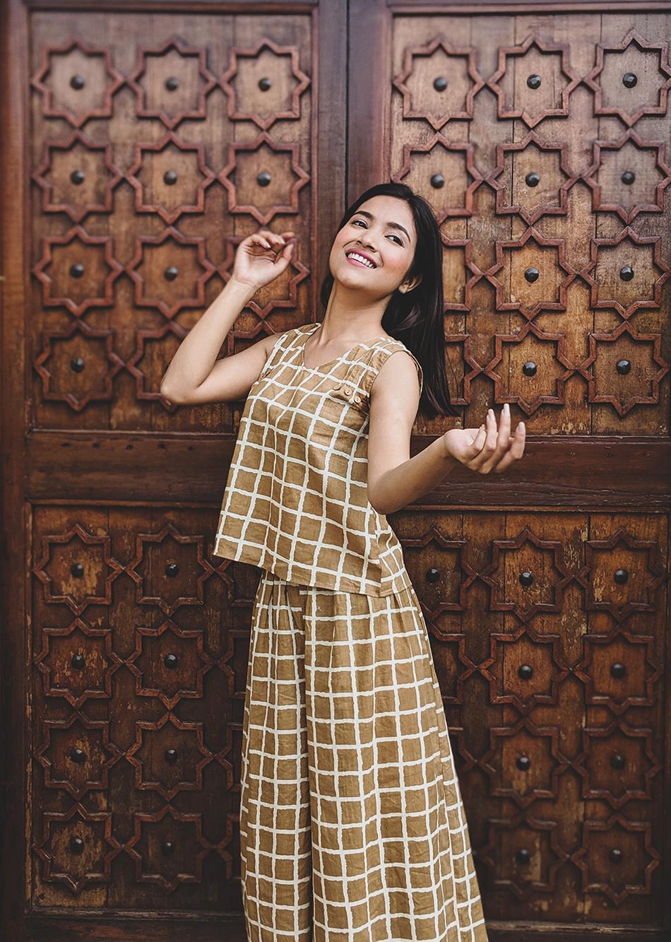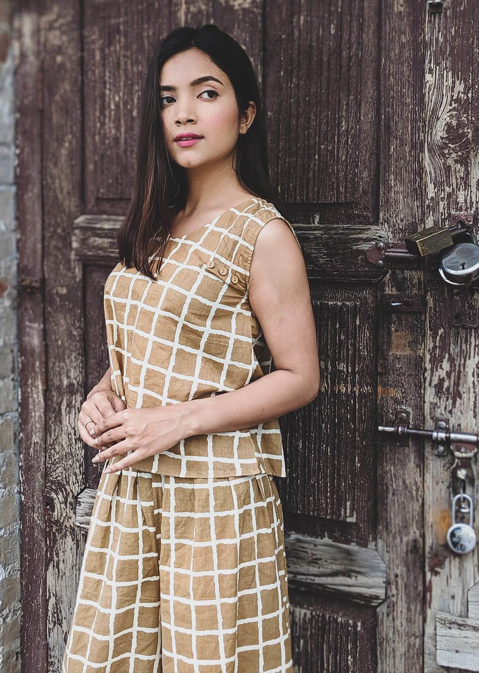 Take a look at our brown checks palazzo pants They're the right combination of comfort and sophistication, suitable for any setting. The traditional checkered pattern offers refinement, and the wide-leg silhouette maximizes comfort.