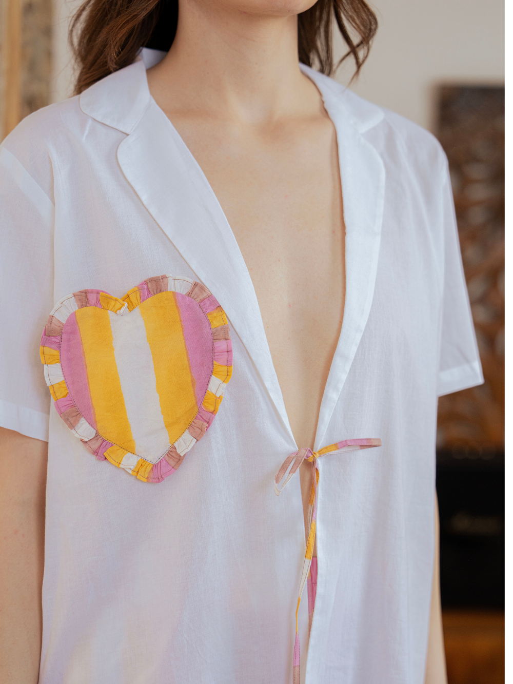Printed heart pocket shirt, stripes bottom, front knot detailing, button closure, pockets |